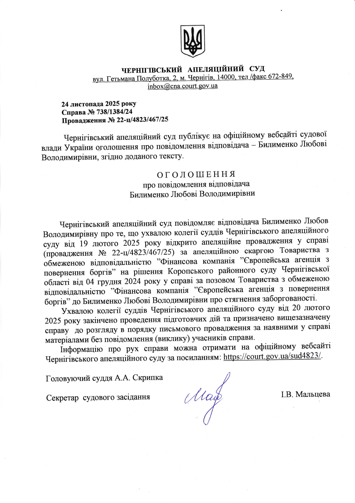 Оголошення про повідомлення відповідача Билименко Л.В.