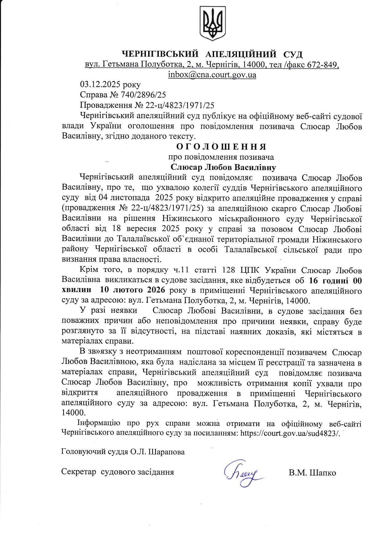 Оголошення про повідомлення позивача Слюсар Л.В.