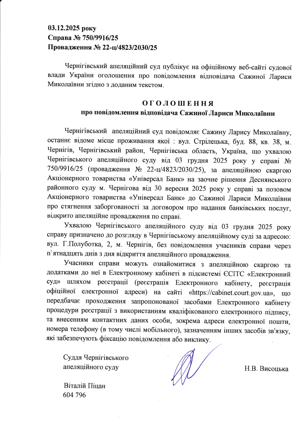 Оголошення про повідомлення відповідача Сажиної Л.М.