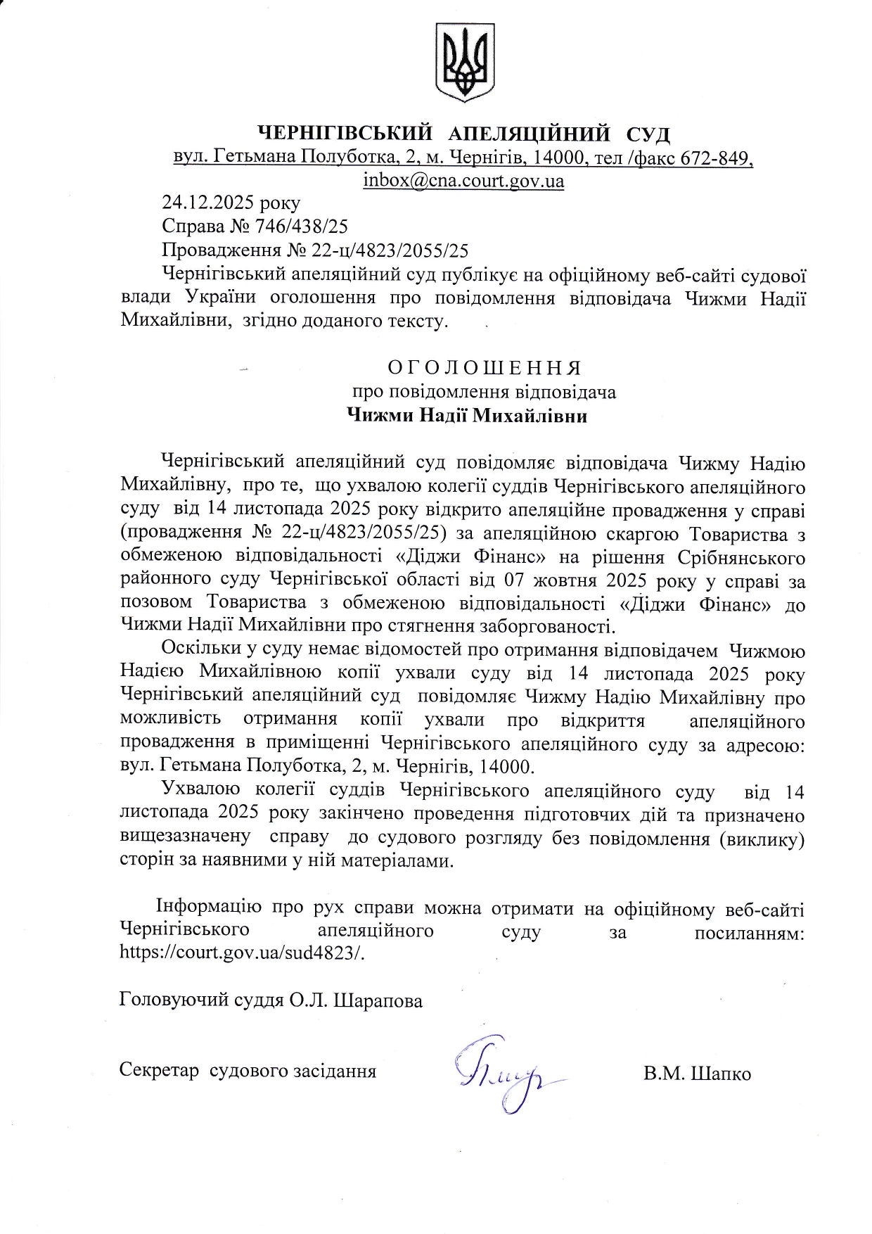 Оголошення про повідомлення відповідача Чижми Н.М.