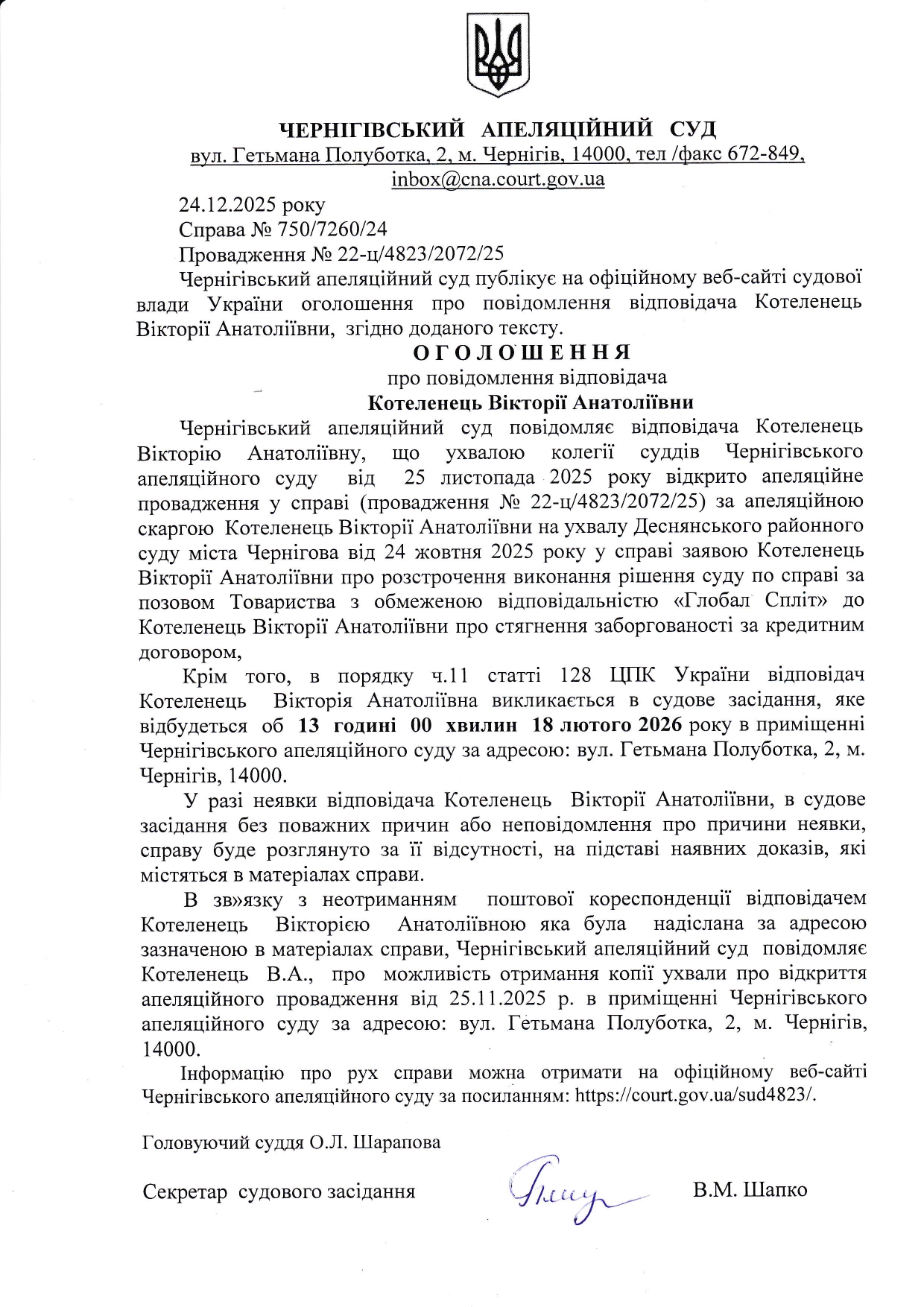 Оголошення про повідомлення відповідача Котеленець В.А.