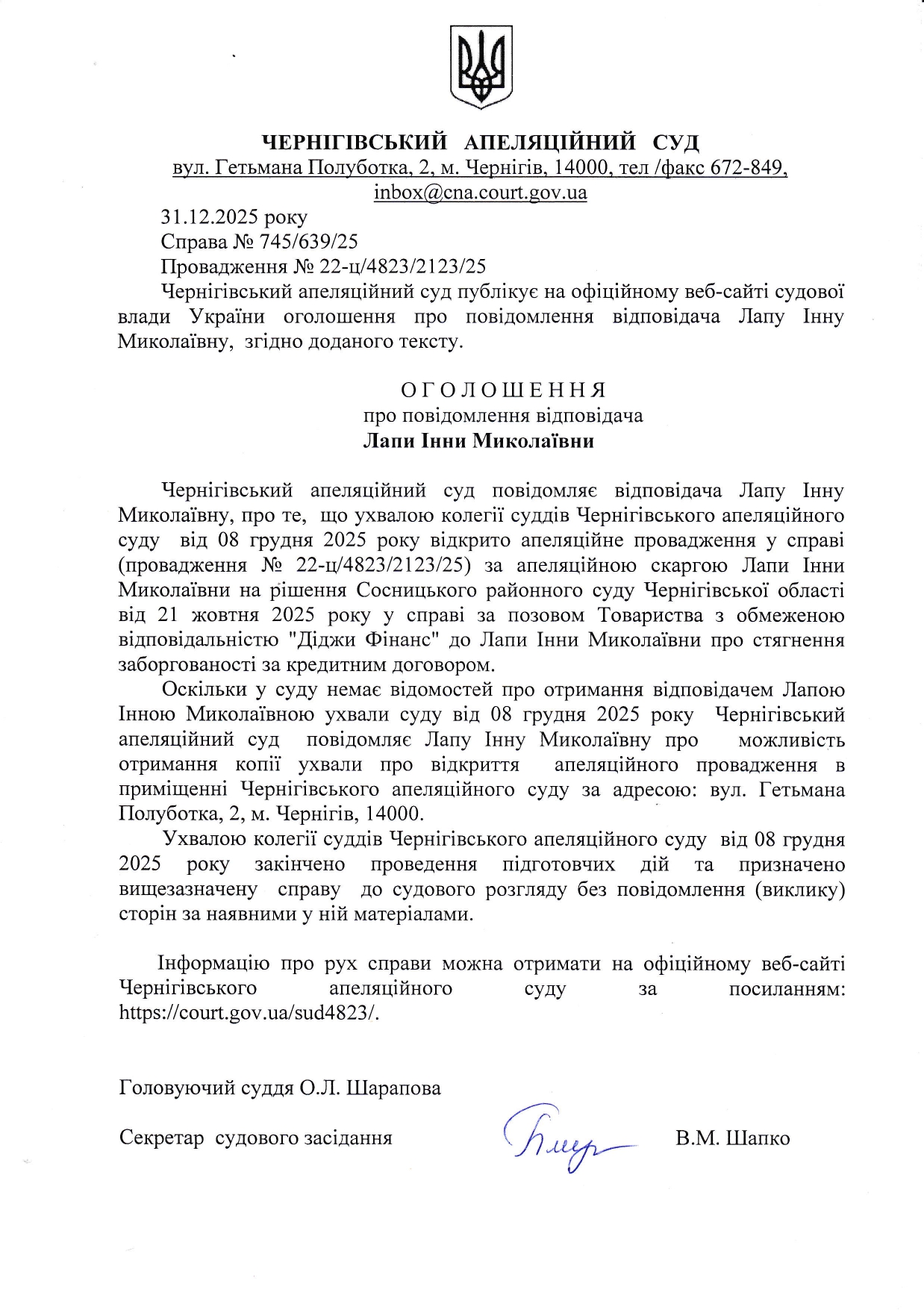 Оголошення про повідомлення Лапи І.М.