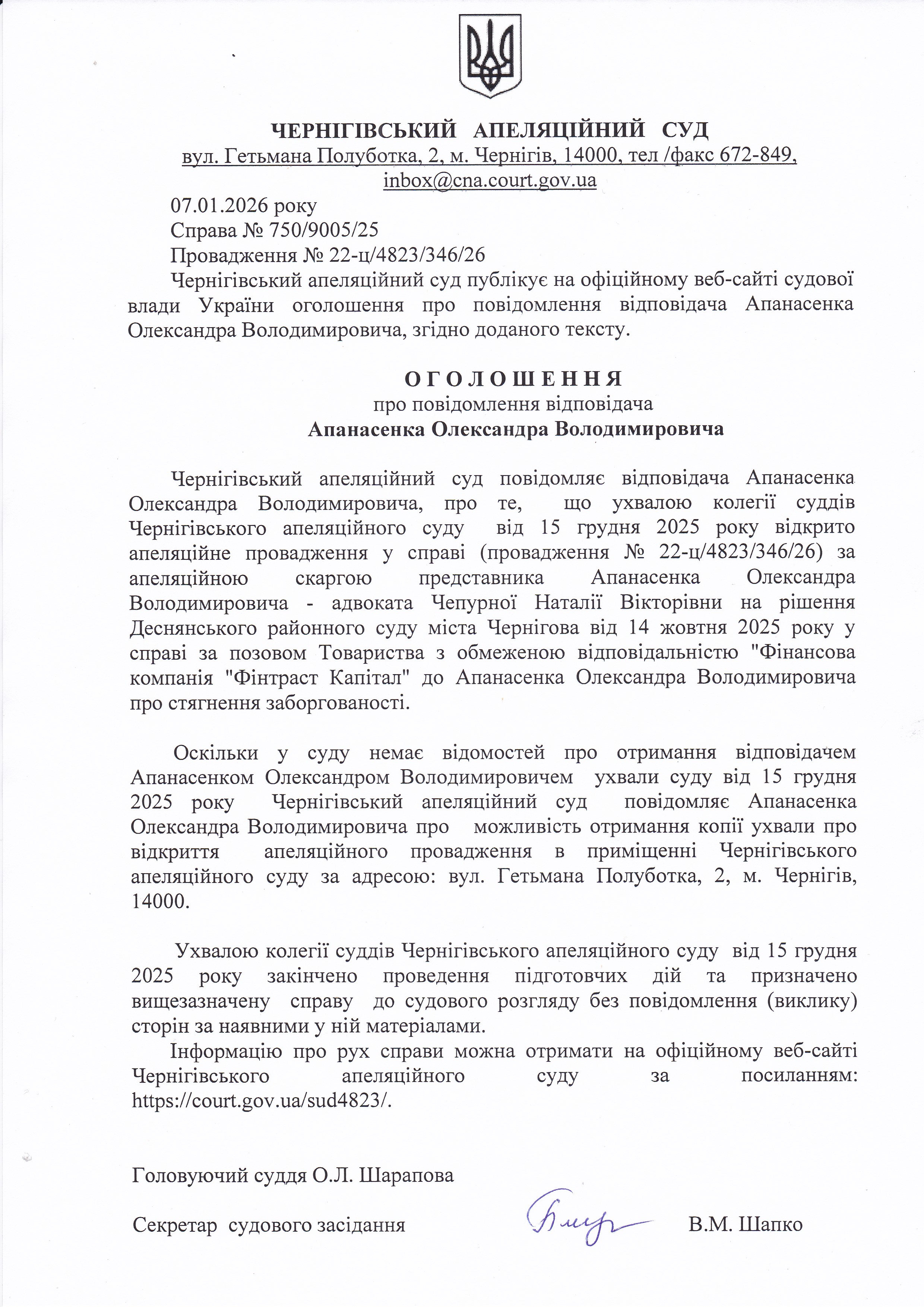 Оголошення про повідомлення Апанасенка О.В.