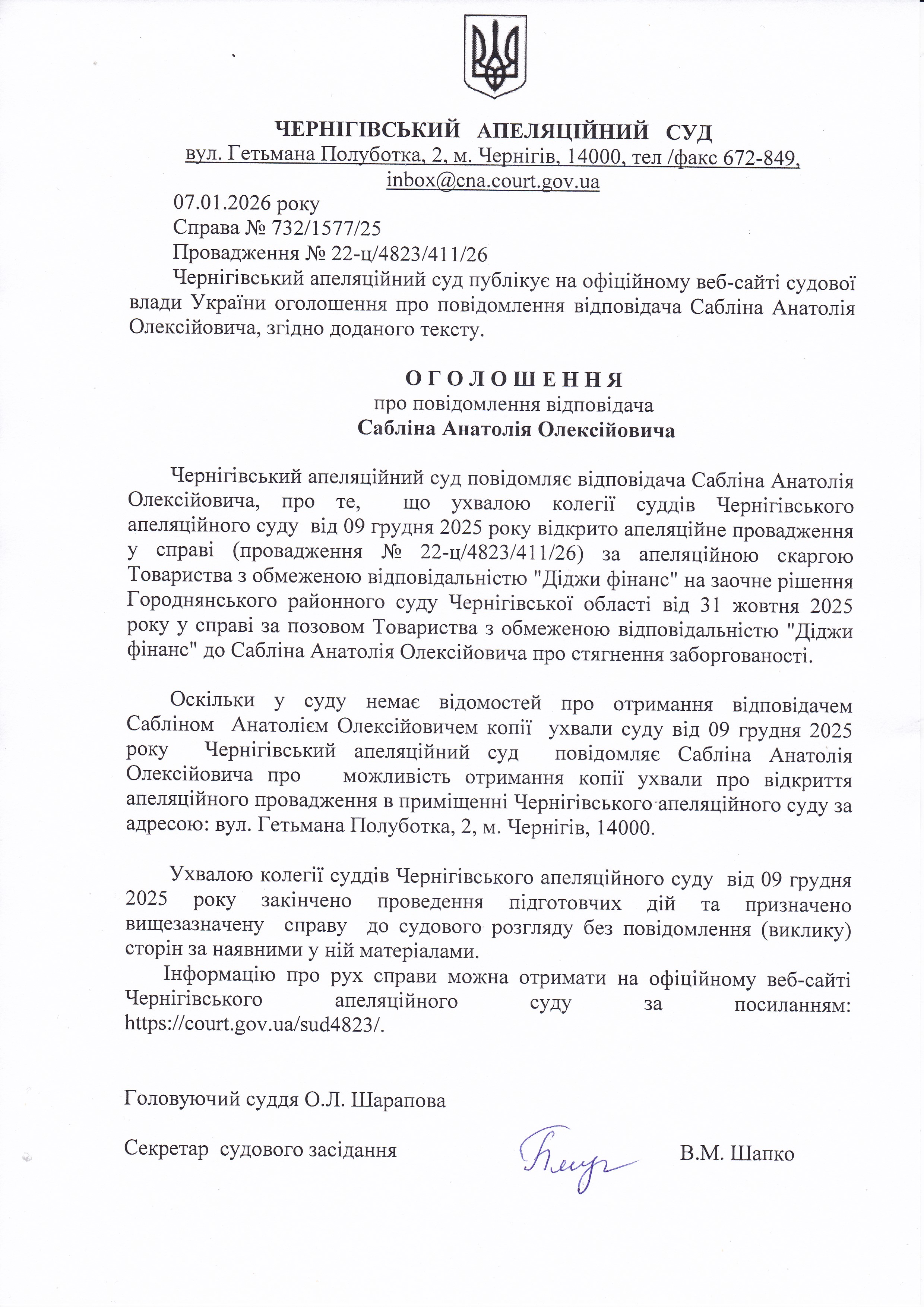 Оголошення про повідомлення Сабліна А.О.