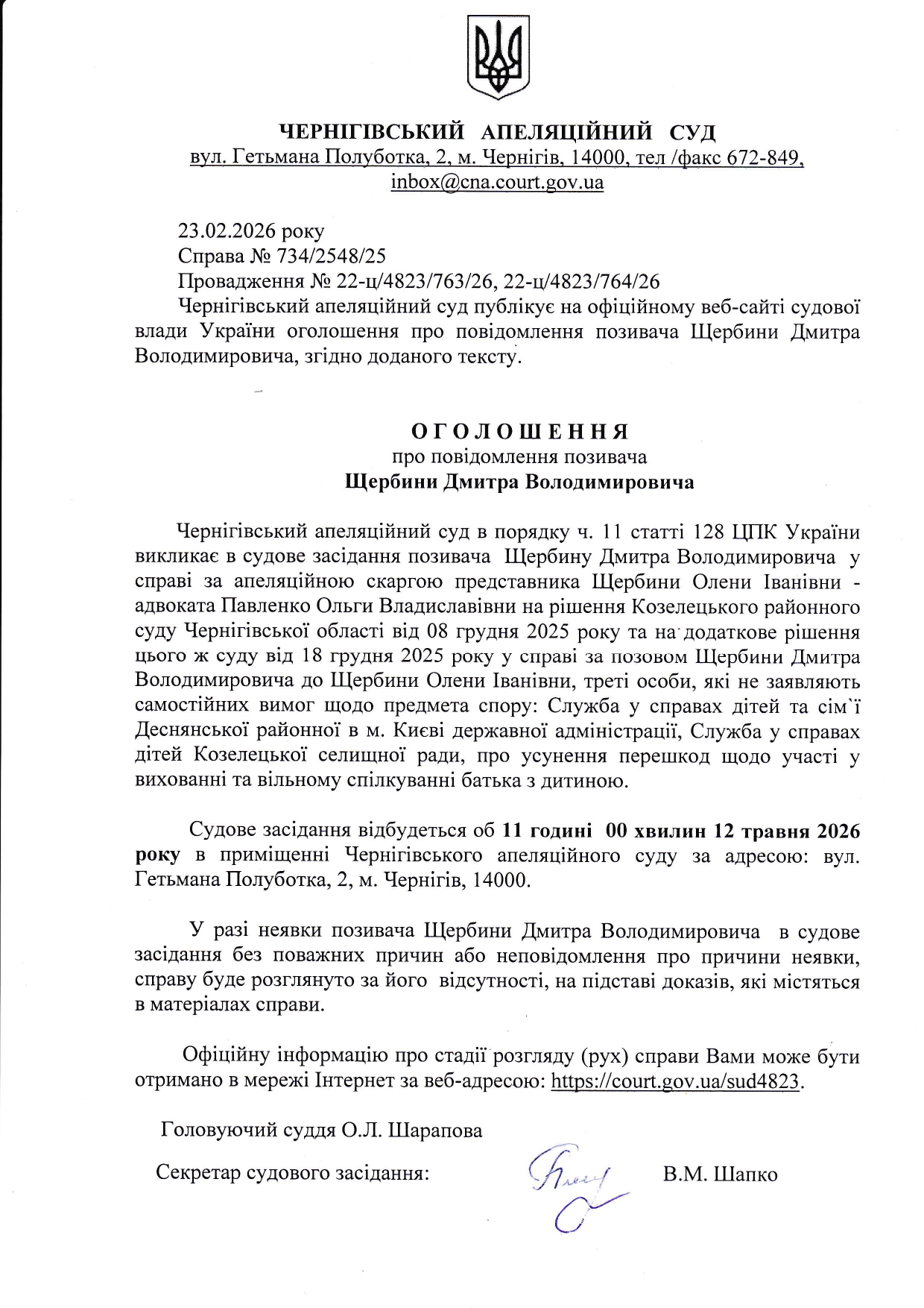 Оголошення про повідомлення позивача Щербини Д.В.