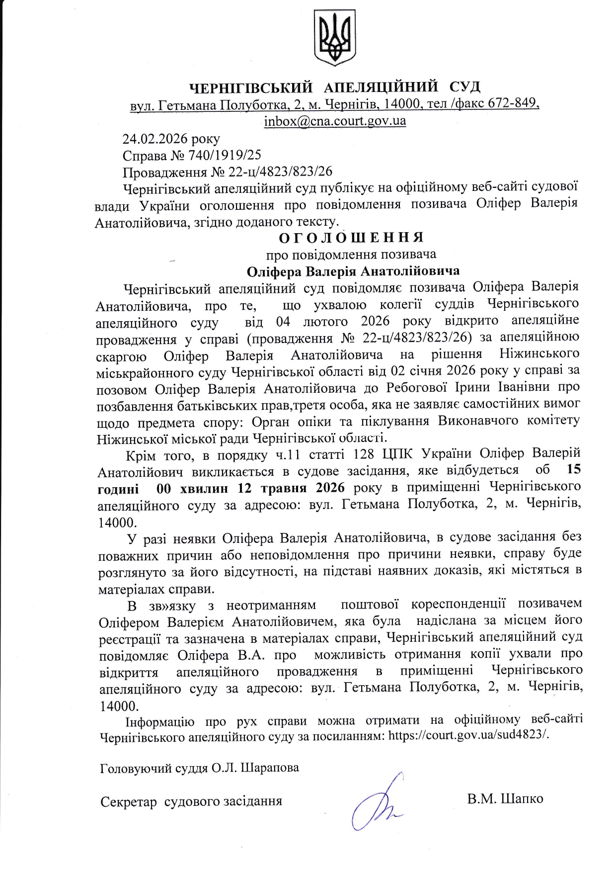 Оголошення про повідомлення позивача Оліфера В.А.