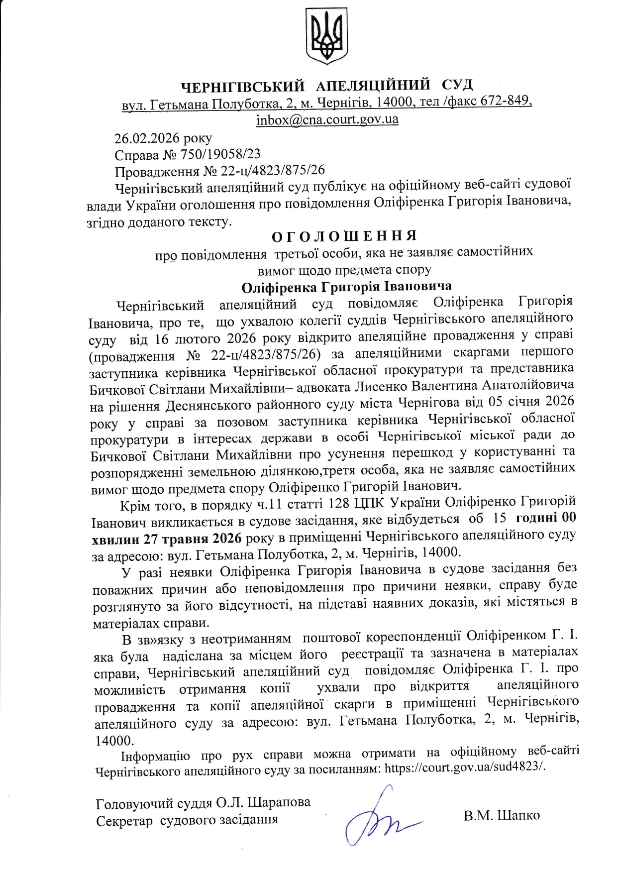Оголошення про повідомлення третьої особи Оліфіренка Г.І.