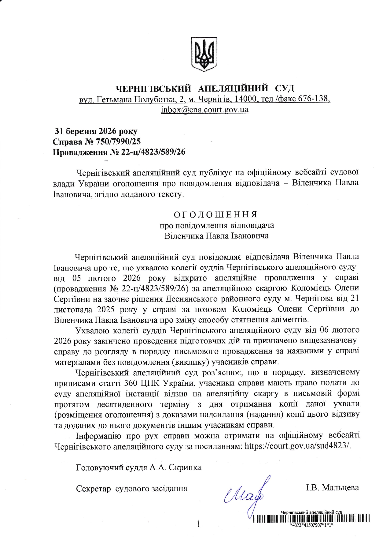 Оголошення про повідомлення відповідача Віленчика П.І.