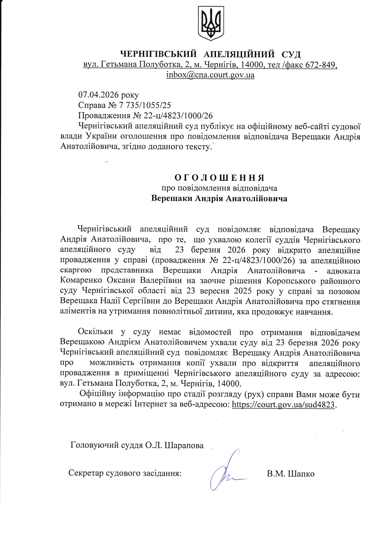 Оголошення про повідомлення відповідача Верещаки А.А.