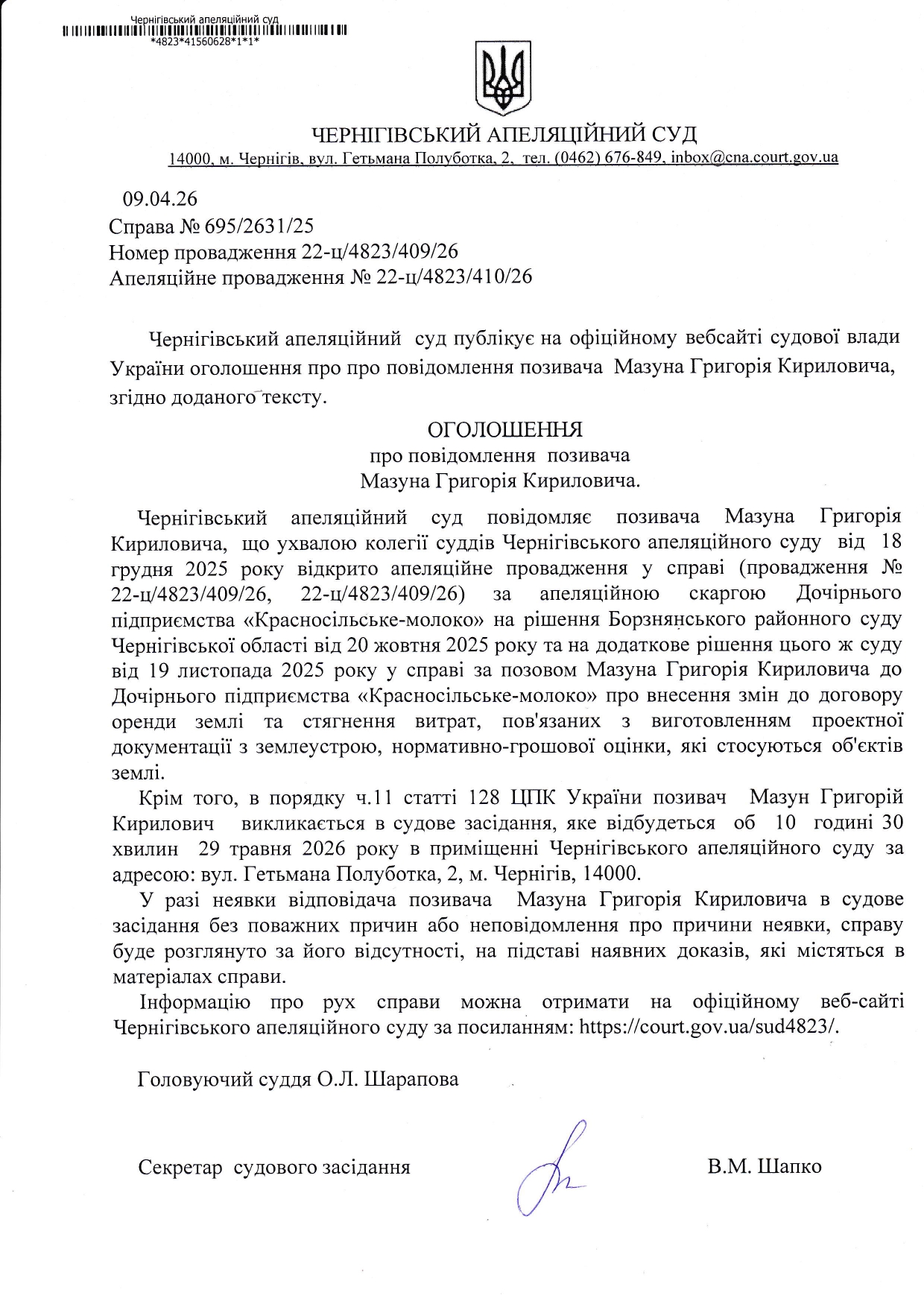 Оголошення про повідомлення позивача Мазуна Г.К.