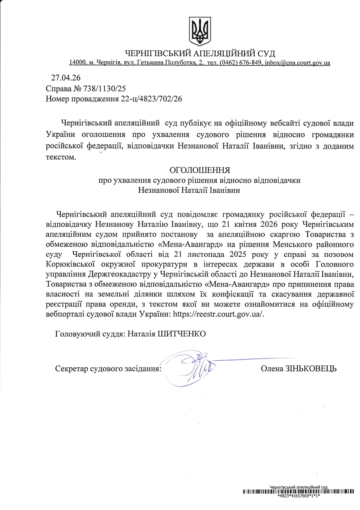 Оголошення про ухвалення судового рішення Незнанової Н.І.